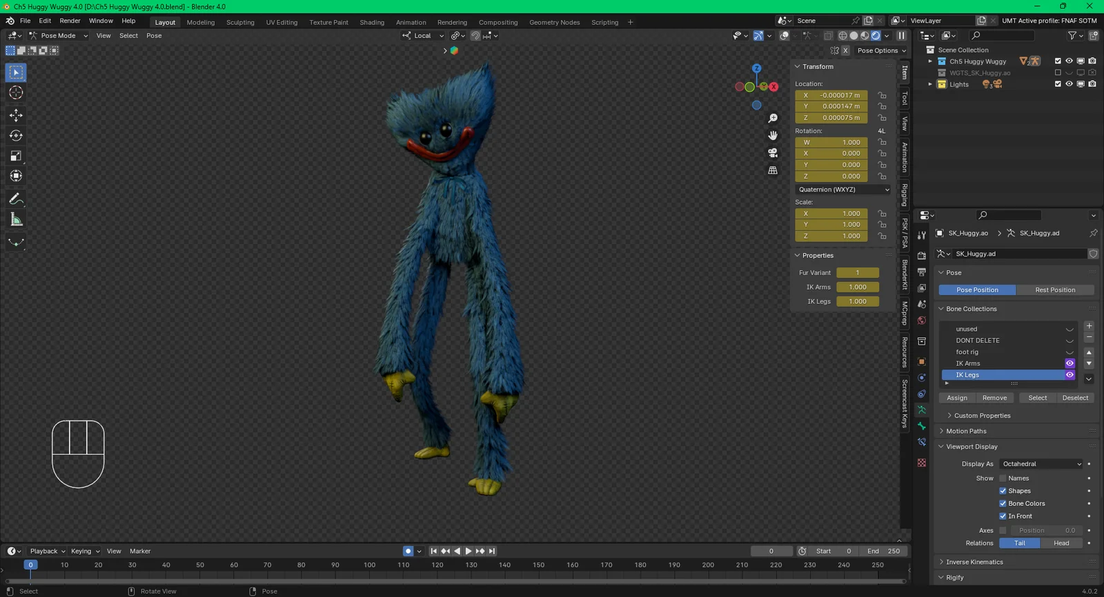 This product provides a rigged 3D model of the character Huggy Wuggy, extracted from the games Poppy Playtime Chapters 4 and 5. The asset is compatible with Blender 4.0 and includes the character's geometry along with an armature setup for posing and animation.