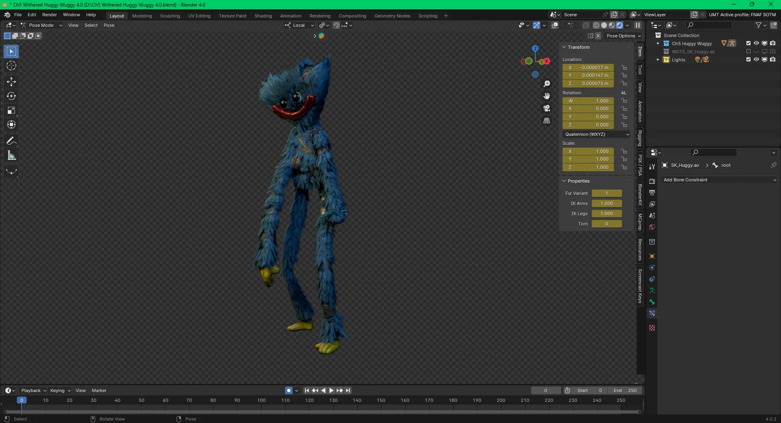 This is a rigged 3D character model of Withered Huggy Wuggy, extracted directly from the game Poppy Playtime by Mob Entertainment. Sourced from chapters 4 and 5 of the game, the asset includes an armature setup for posing and character animation within Blender.
