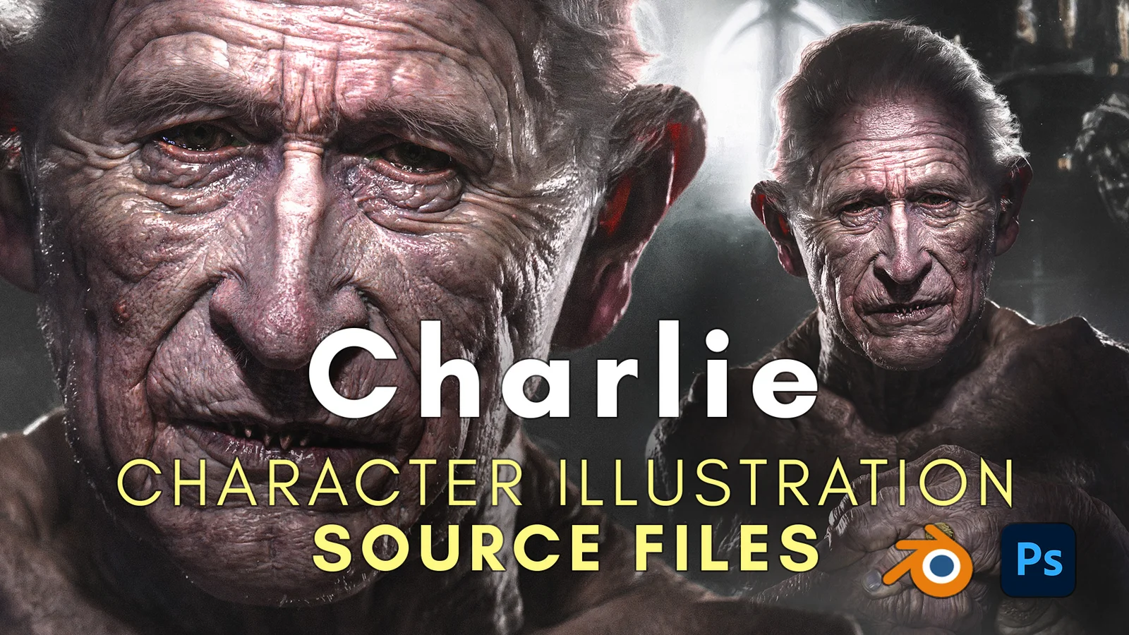 The project utilizes Blender's attribute painting system and includes a bonus procedural eye generator. Accompanying Adobe Photoshop files are also provided for examining the final post-processing and compositing workflow.