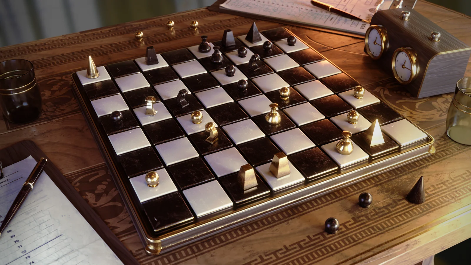 A collection of 3D models featuring modern and classic chess sets. The asset includes fully modeled chessboards and pieces, complete with pre-configured materials for the Cycles render engine.