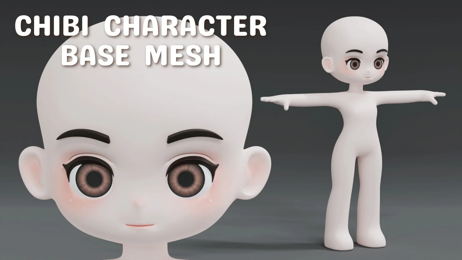 A base mesh designed as a starting point for creating chibi-style characters. The model includes a base skin texture and four different eye iris color textures at 1024x1024 resolution. It features a polygon count of 10,956 and a vertex count of 10,959, making it suitable for real-time applications such as game development and VR/AR experiences. The asset is provided in multiple standard industry formats including .blend, .fbx, .obj, .dae, and .gltf.