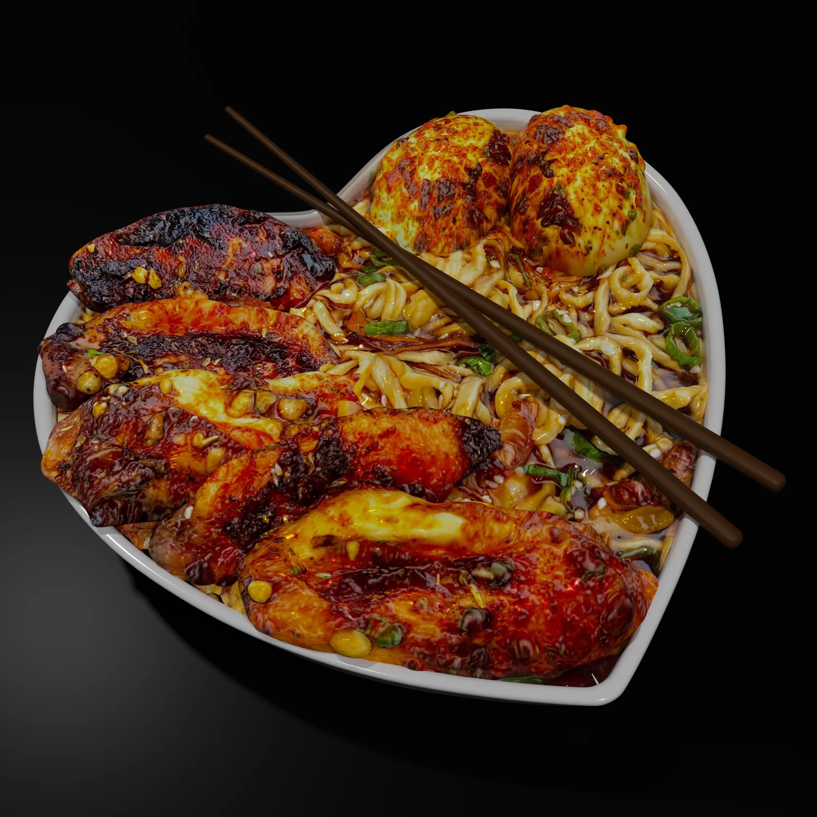 A high-poly 3D model featuring a chicken wing ramen dish. The asset includes the ramen presented in a bowl alongside a set of chopsticks.