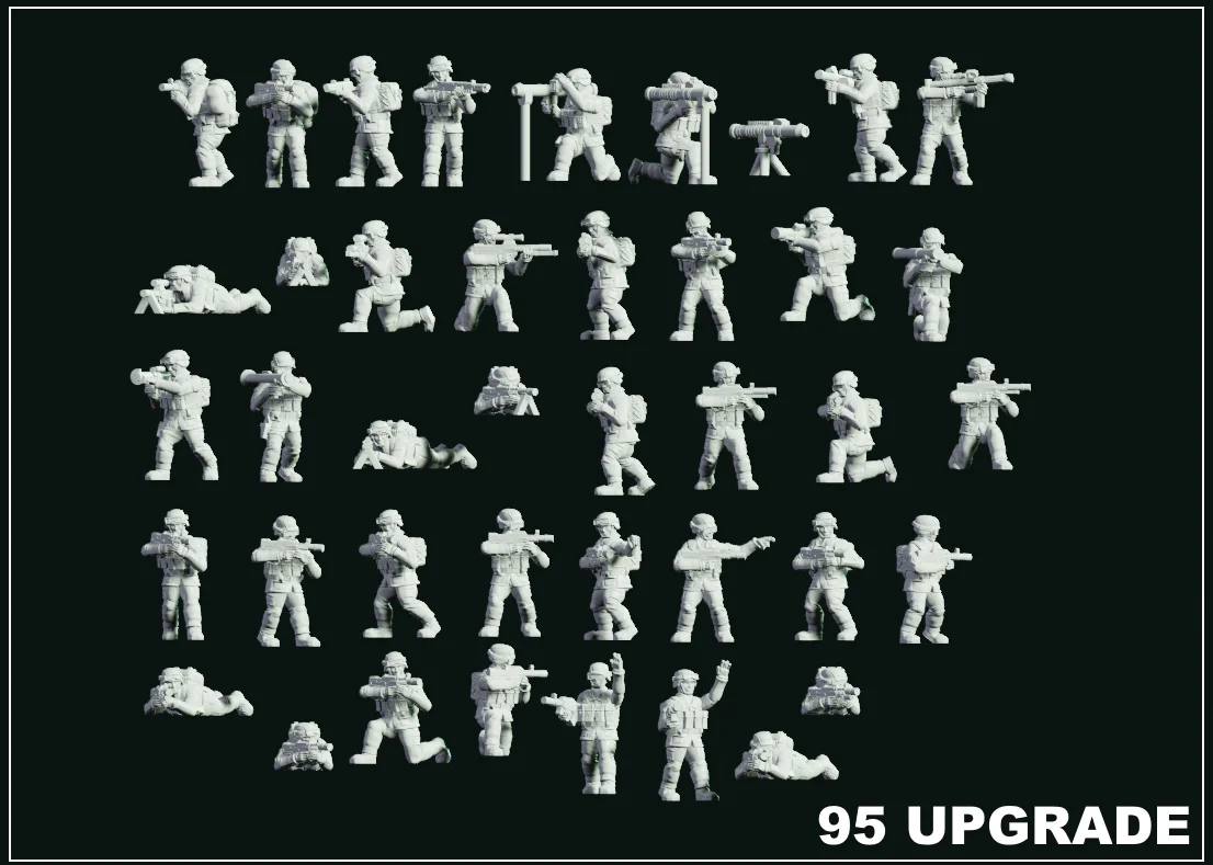 A collection of 3D printable soldier miniatures designed for modern military tabletop setups. The models depict soldiers equipped with Type 95 chest rigs and feature both raised and lowered goggles. The set includes figures armed with a variety of weapons, such as QBZ Type 95 rifles, QLG 10 grenade launchers, QBS 9 shotguns, QBB Type 95 light machine guns, and QBU 88 marksman rifles.