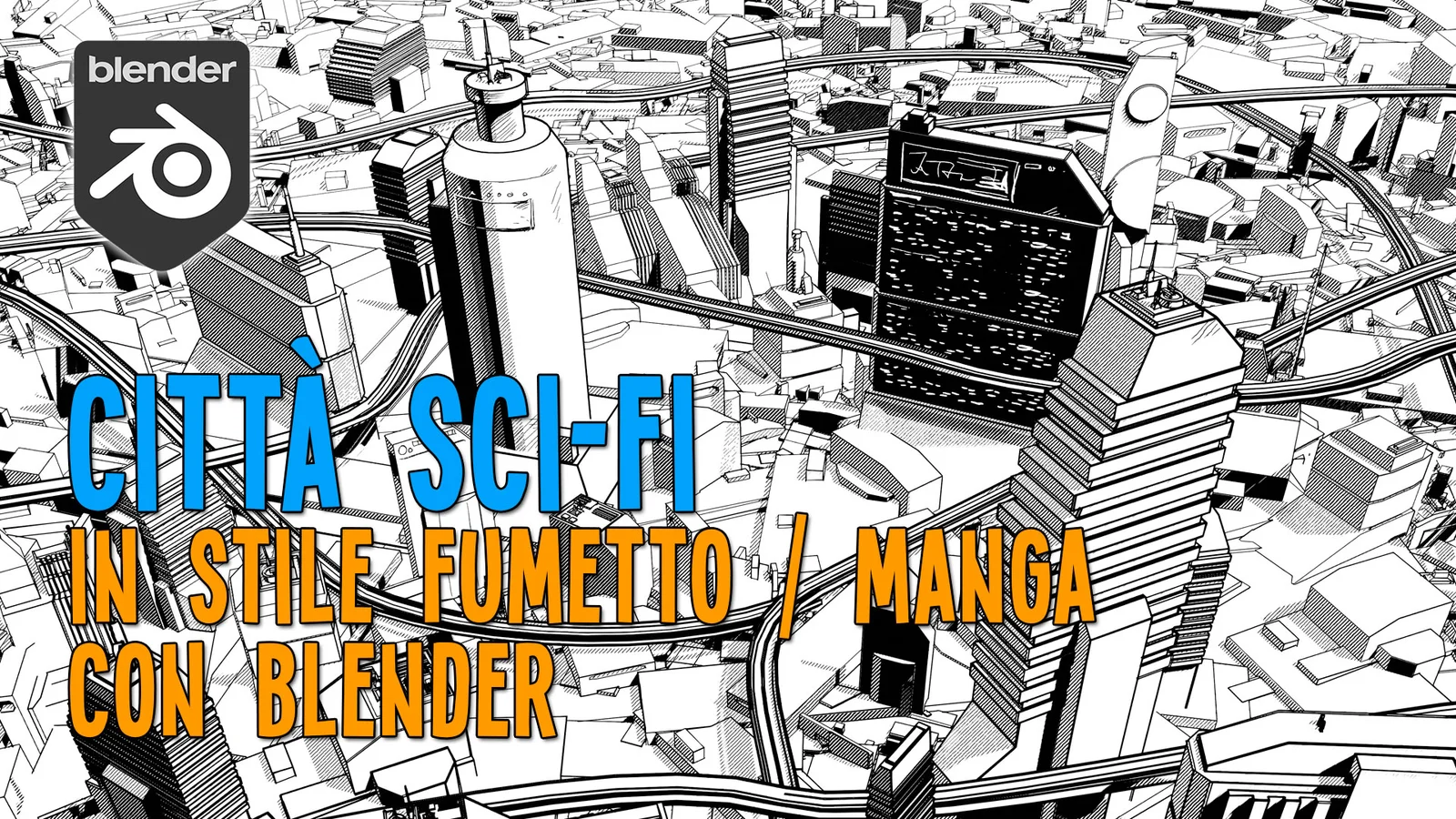 This is a four-hour video tutorial with Italian audio that teaches how to create high-resolution, comic and manga-style science fiction cities. It covers the entire process using base Blender tools, starting from modeling individual buildings with the Bool Tool to arranging a coherent urban environment complete with streets and roof details.