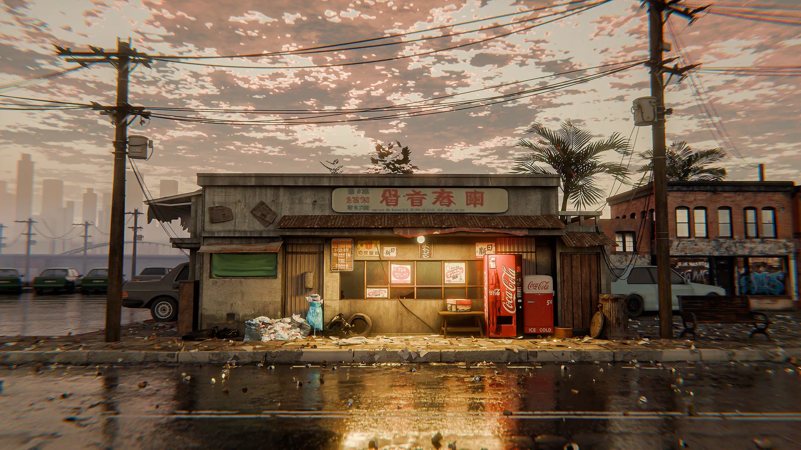 A complete 3D city scene provided as a Blender project file. The scene is intended for educational purposes, allowing users to explore the setup and details of the environment. The project was created using Blender and Photoshop.