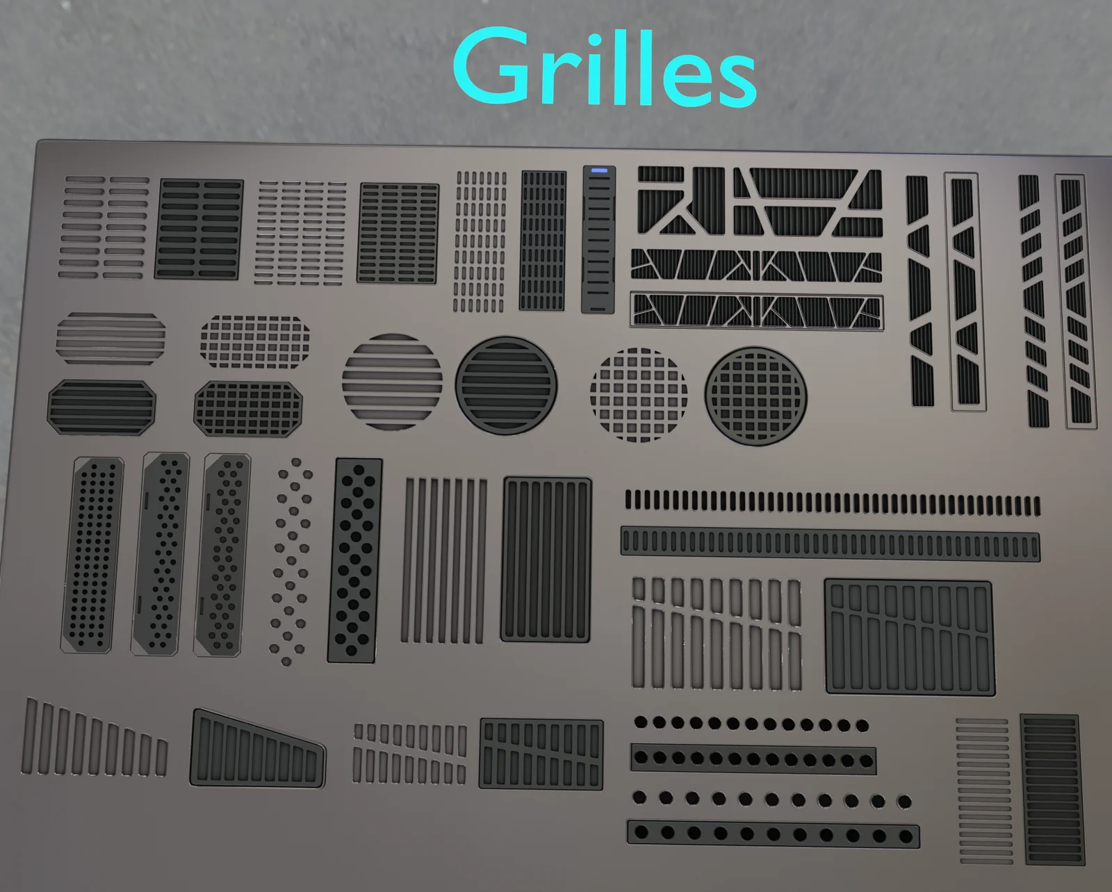 A collection of 60 grille and vent decals formatted specifically for use with the Decal Machine add-on. The decals are baked at 1024 resolution with 4X sampling to maintain high surface detail. They can be integrated directly into existing Decal Machine libraries by unpacking them into the designated decal directory.