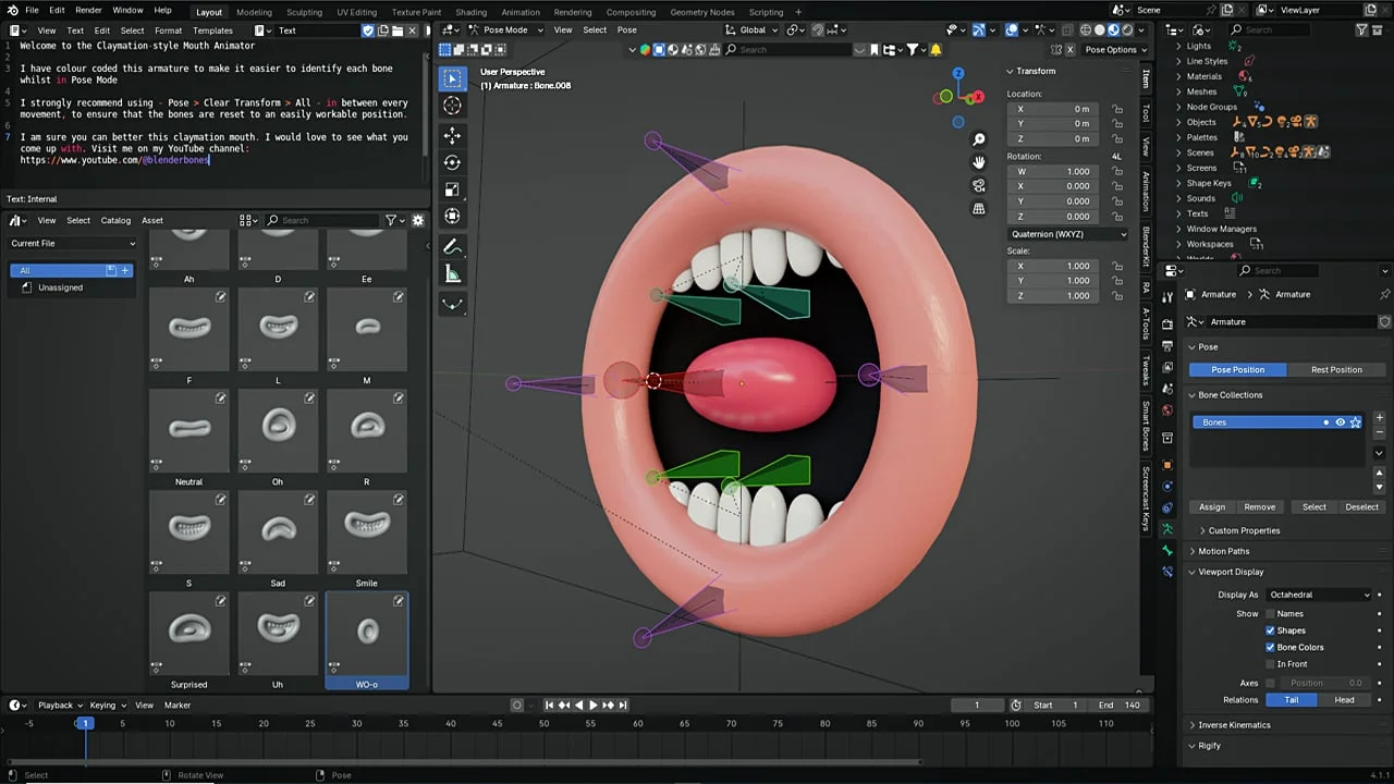 The file includes a premade Asset Pose Library with predefined mouth shapes to assist with animation. The setup is designed for integration into character animation workflows, allowing users to manipulate the mouth components for various expressions. A companion video tutorial demonstrating the creation of the model is available.