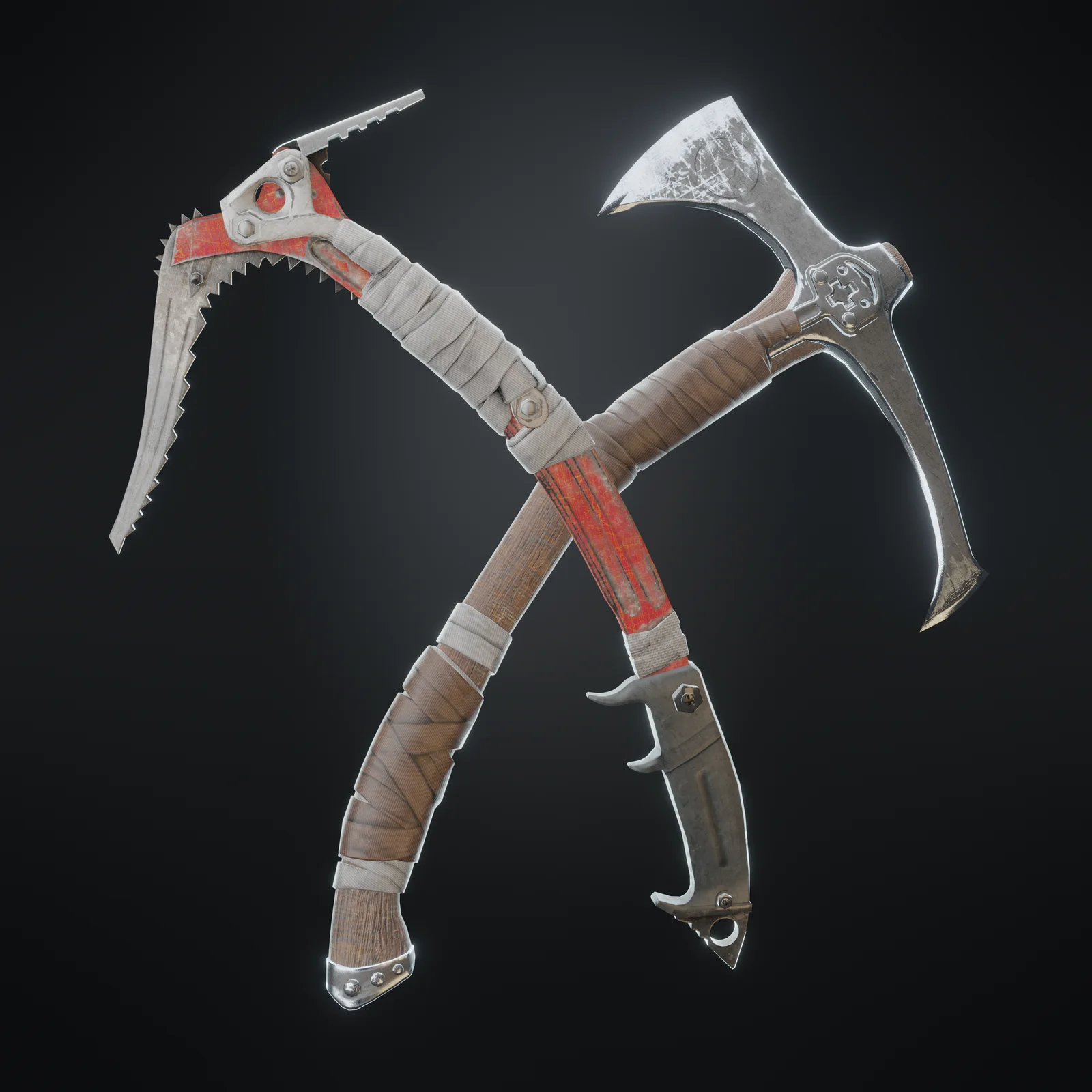 A fully custom rigged 3D model of the climbing axes from the Tomb Raider video game series. The setup includes two distinct visual variants: a standard climbing axe and a battle axe.