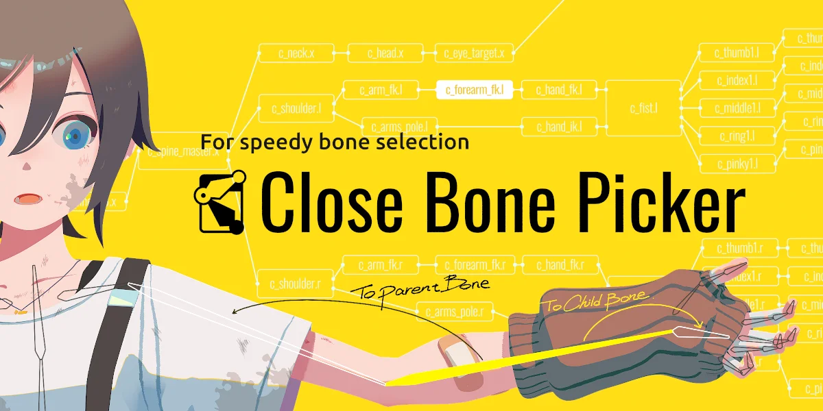 Close Bone Picker is an add-on that optimizes bone selection workflows for character animation. It allows animators to navigate armatures using keyboard shortcuts based on a custom bone hierarchy. This hierarchy is built visually using a dedicated node editor, enabling users to define selection paths that match their specific animation needs rather than relying solely on the default armature structure.