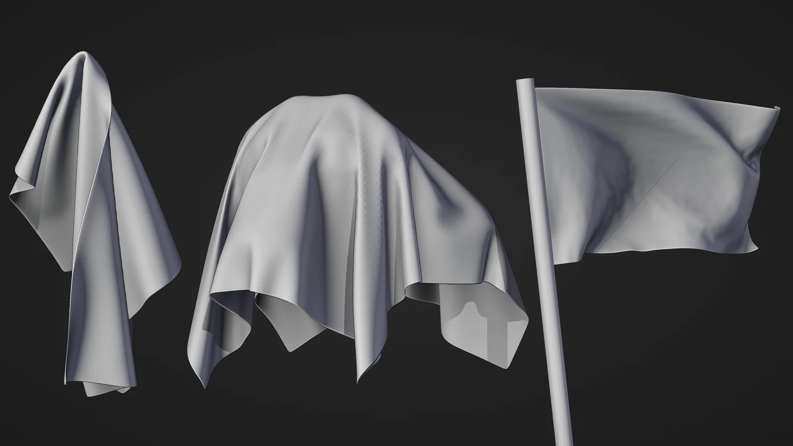 These are the companion project files for a beginner-focused cloth physics tutorial in Blender. The collection includes three separate Blender files demonstrating different cloth simulation scenarios: a hanging towel, an animated flag, and cloth draped over a collision object. These files serve as practical reference material for examining and learning how to configure basic cloth dynamics.