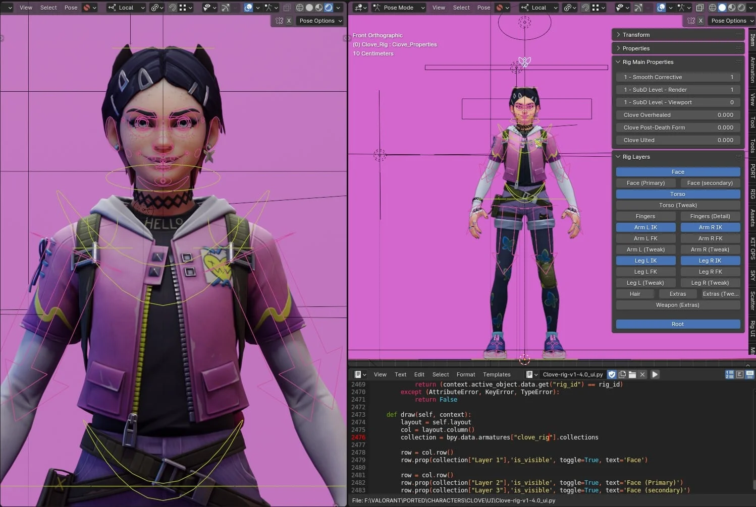 A rigged character model of Clove from the game Valorant, prepared for use in Blender. The setup utilizes Rigify layers and includes custom face controls for facial animation. The rig features standard IK-FK functionality and custom properties for switching shaders.