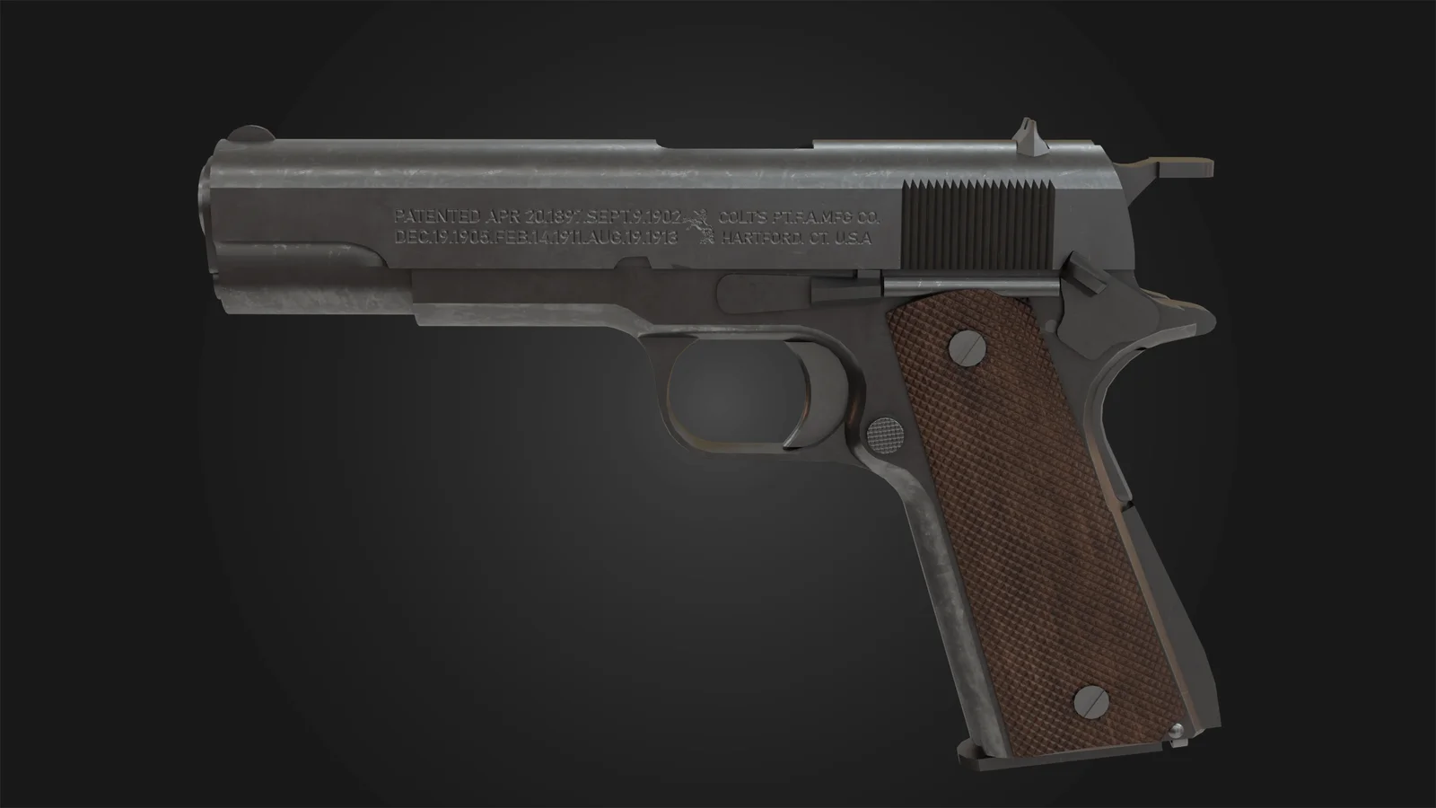 A low-poly, game-ready 3D model of a Colt M1911 pistol. The model features 4K resolution textures and is built with separated components to facilitate custom rigging and weapon animation workflows. The package includes both FBX and OBJ file formats alongside the texture set.