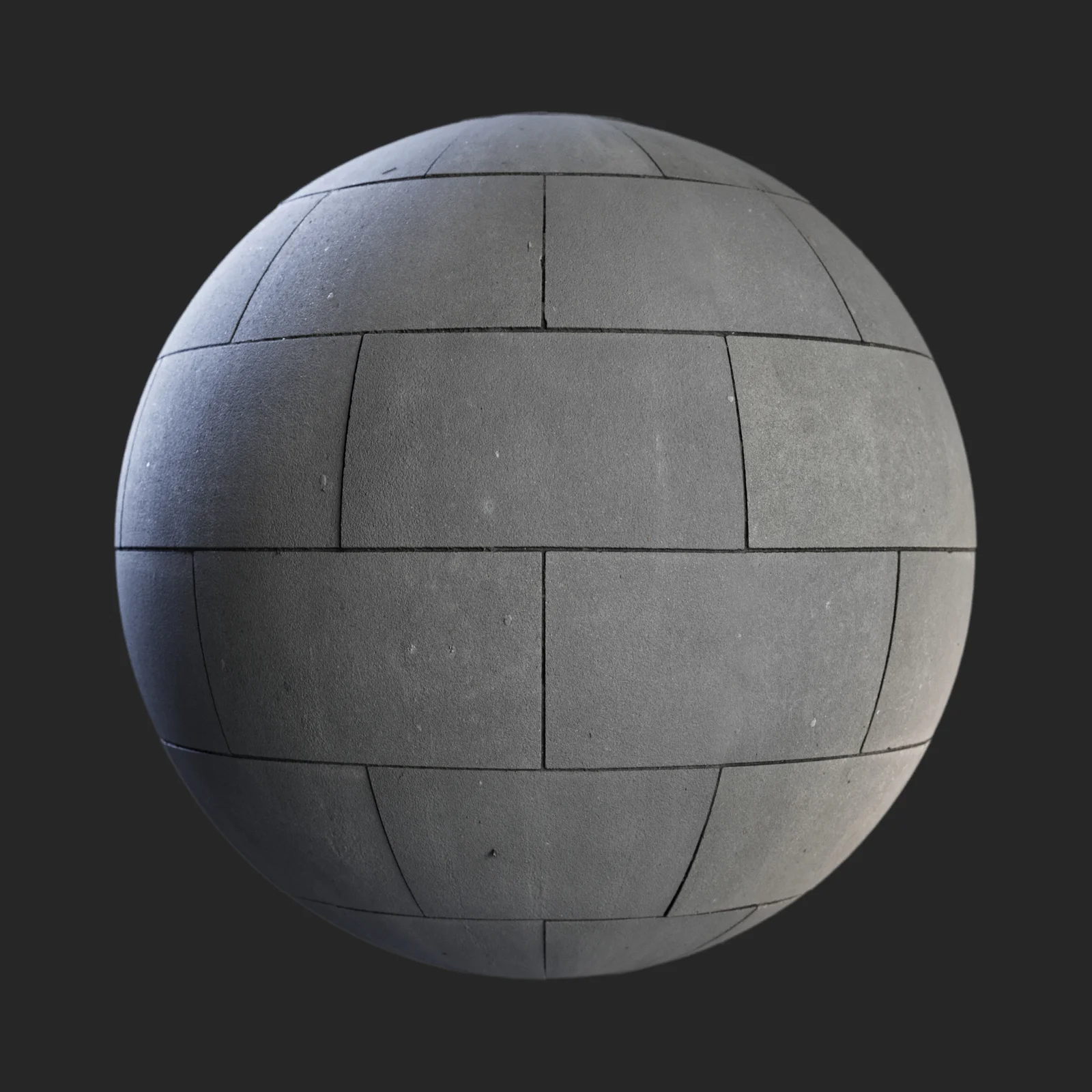 A set of seamless PBR textures featuring large concrete tiles arranged in a running bond pattern. The scanned surface originates from Berlin, covering an approximate real-world area of 3 by 3.41 meters, with individual blocks measuring around 0.5 by 1.15 meters. The texture set includes albedo, roughness, ambient occlusion, normal, and 16-bit height maps, available in both 4K and 8K resolution.