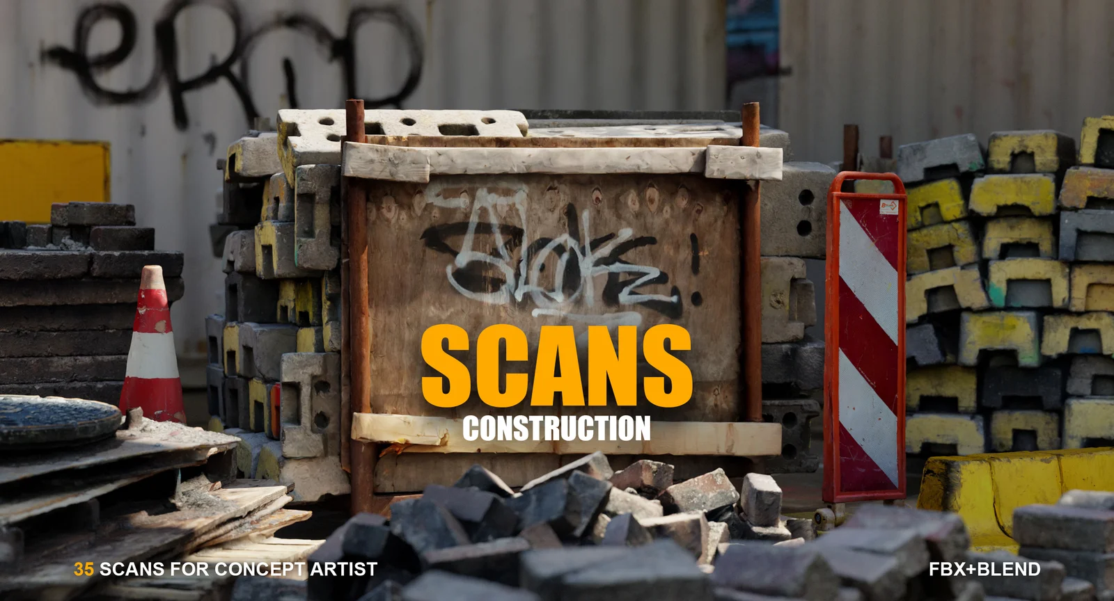 This product provides a collection of 35 3D scanned construction assets. The models are optimized using the decimate modifier and feature a total vertex count of 868,000 across the set. They include high-resolution JPG textures ranging from 4K to 8K, which contain baked soft ambient shadows. The package includes a pre-configured .blend file ready for the Blender Asset Browser alongside standard FBX files. These assets are intended primarily for concept art workflows and are not designed as game-ready models.