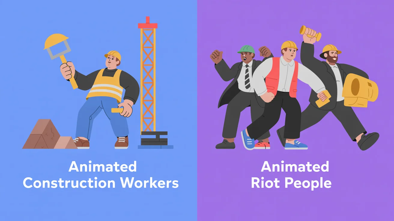 This bundle combines two distinct collections of animated 3D character models configured as asset library files. The package includes a set of animated construction workers alongside a collection of animated riot figures. These assets are formatted for quick drag-and-drop placement to populate industrial scenes or protest environments.