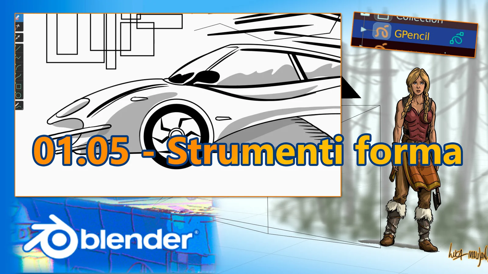 Provides supplementary materials for lesson 1.05 of a Grease Pencil training course focusing on shape tools (strumenti forma). The package includes a printable PDF handout and the Blender scene files generated during the corresponding video lesson. Materials are provided in Italian.