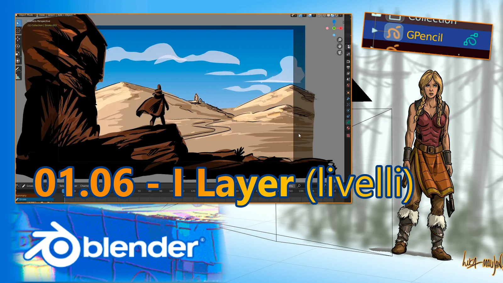 This educational package provides the supplementary materials for module 1, lesson 6 of an Italian-language Grease Pencil course focused on layer functionality. The download includes a printable PDF handout, the .blend files generated during the video demonstration, and accompanying JPG image files.