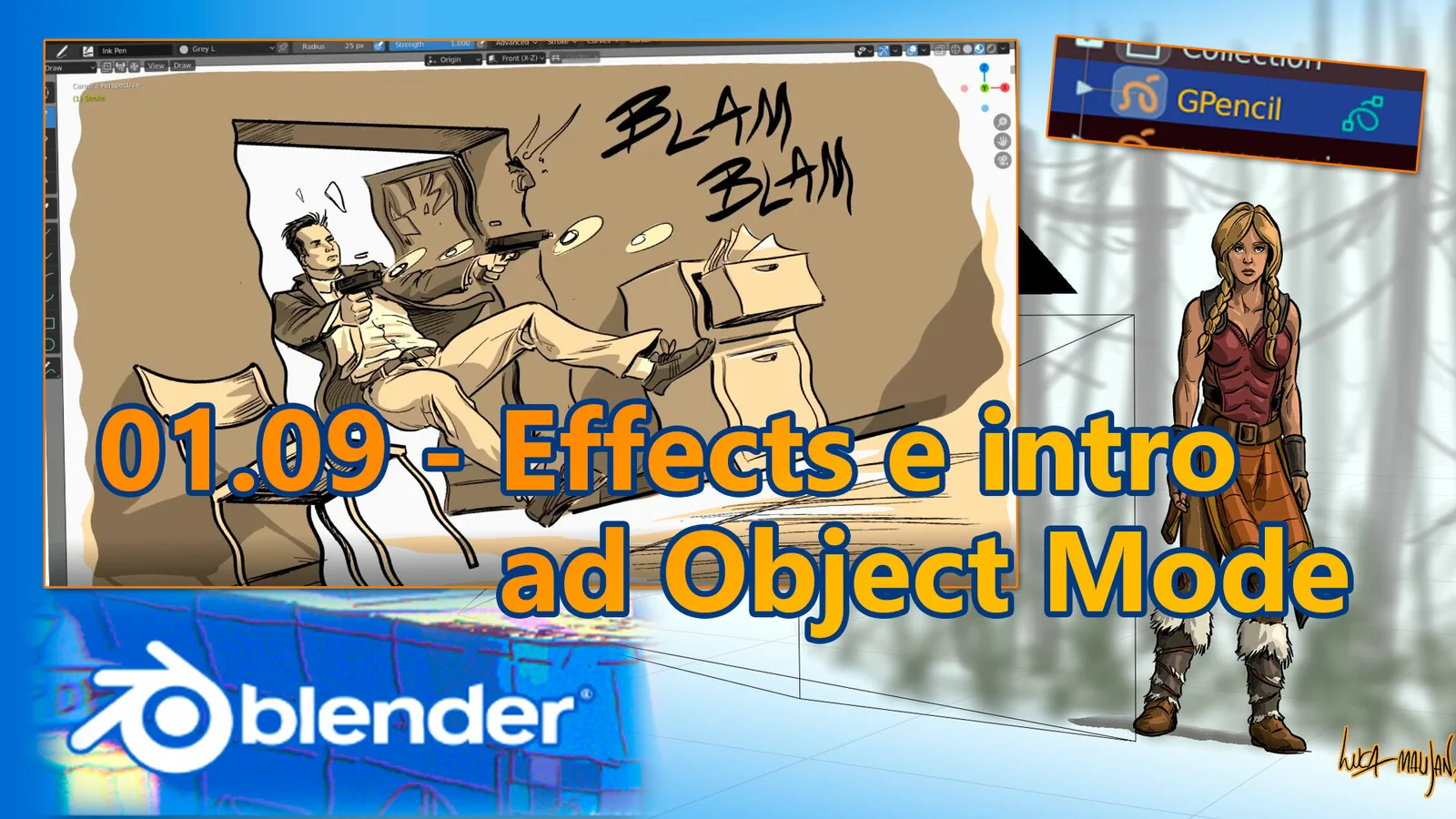 This Italian-language learning module focuses on applying effects within Blender's Grease Pencil. It provides the supplementary materials for the ninth lesson of the first module in the creator's broader Grease Pencil series. The package includes a printable PDF handout with lesson notes and the complete .blend file constructed during the video demonstration.