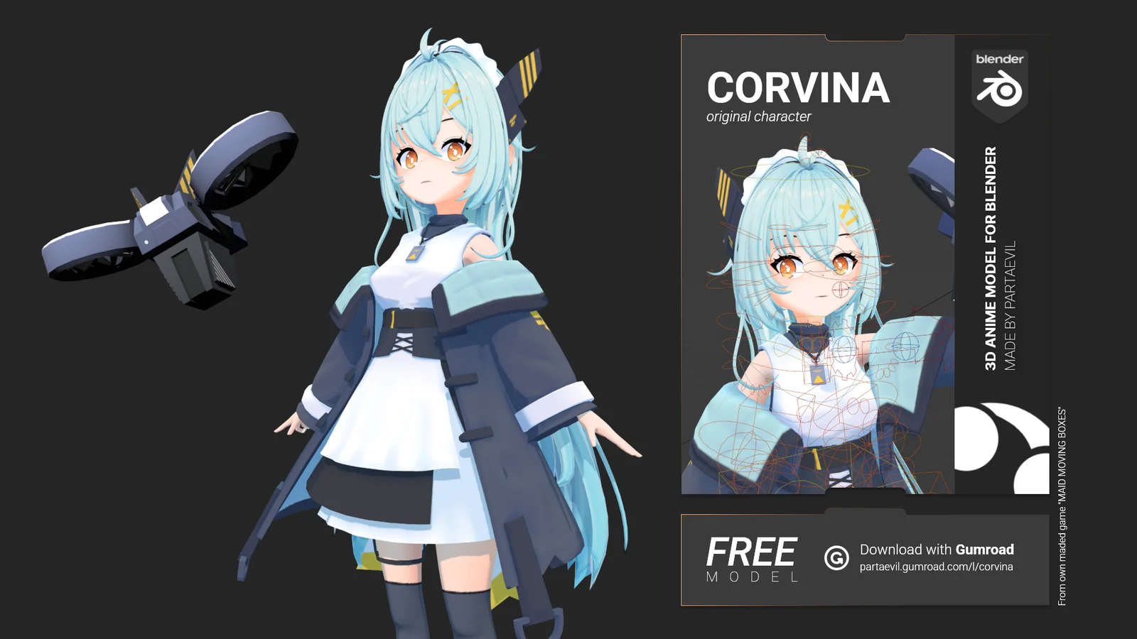A 3D anime-style character model of Corvina from the game Maid Moving Boxes. The Blender scene includes the rigged character, though the developer notes the weight painting was completed quickly and may require refinement for complex animation. A separate collection within the file contains a companion drone model.