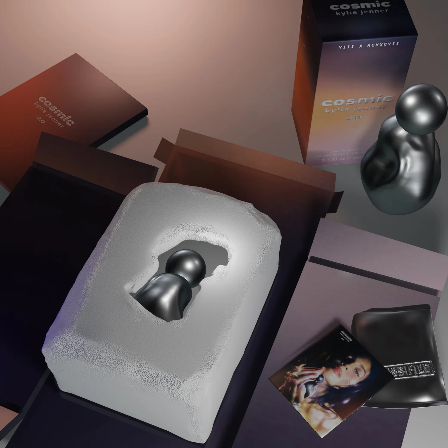 This asset is a 3D model representing the Cosmic 2.0 Eau de Parfum PR package, inspired by Kylie Cosmetics. The model includes the perfume bottle and its accompanying keepsake display box. It is designed for use in Blender and is compatible with both the EEVEE and Cycles render engines.