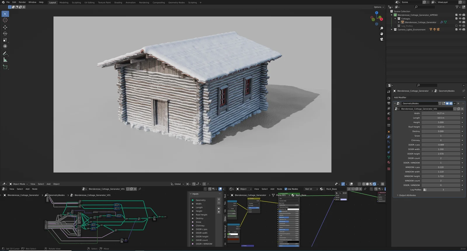 This Geometry Nodes setup allows for the procedural generation of wooden log cottages. It features customizable parameters for adjusting the structure, including automated spacing for windows and doors, destruction effects, and three different log profiles for the walls. The generator includes simple materials and specialized snow shaders that let users control the amount and direction of snow accumulation. All main configurations can be modified directly through the advanced global settings in the Geometry Nodes modifier panel.