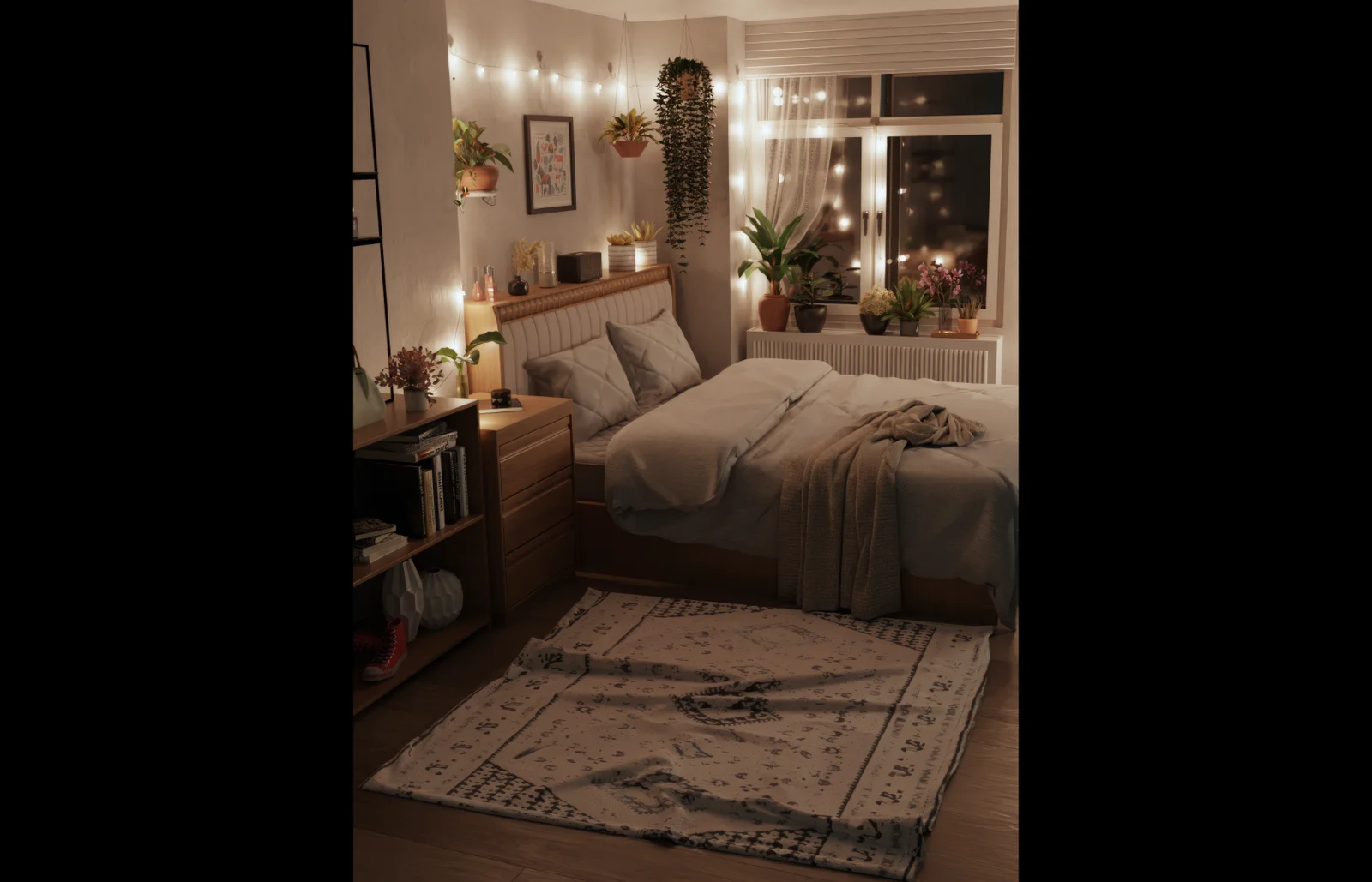 A nighttime bedroom interior scene setup configured for rendering in Cycles. The file is optimized to achieve relatively fast render times on lower-end hardware configurations, such as standard laptops equipped with mid-range mobile GPUs. This pre-configured scene is suitable for interior design architectural visualization and lighting studies.