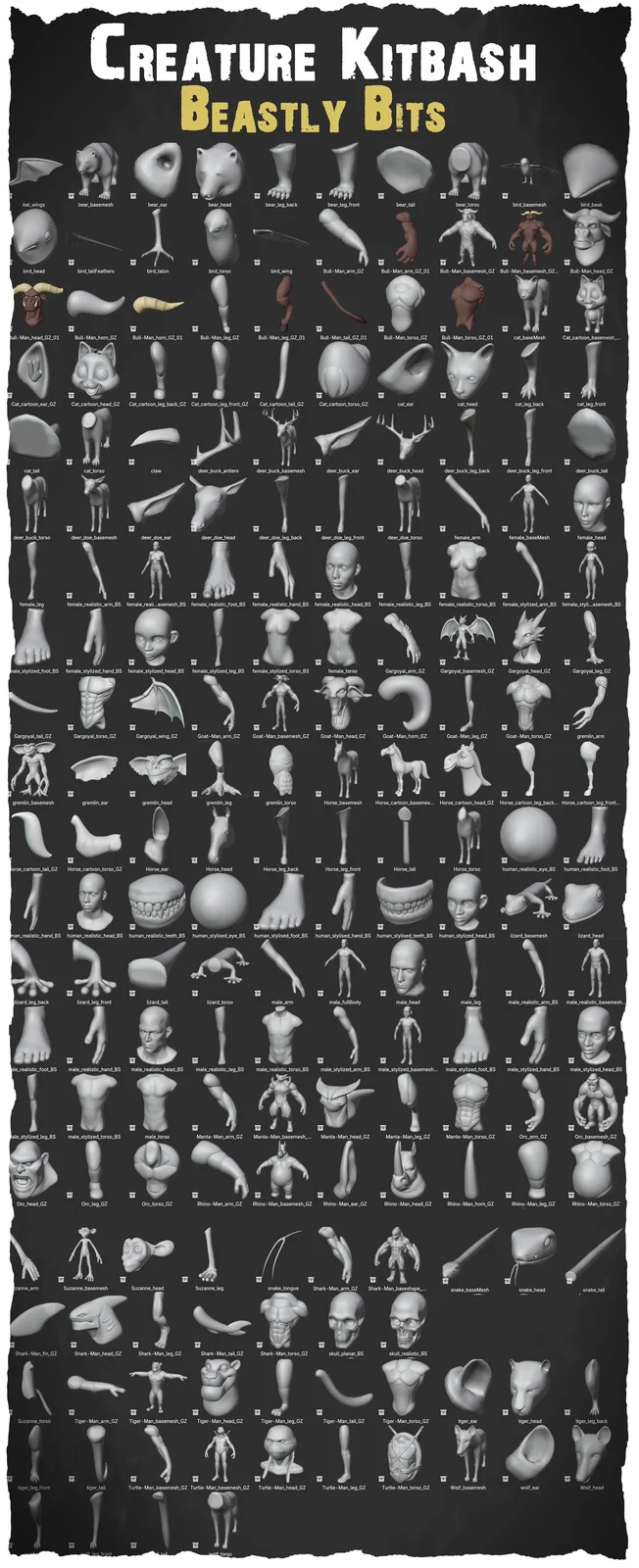 Creature Kitbash: Beastly Bits provides a comprehensive library of modular 3D assets designed for rapidly assembling creature base meshes in Blender. The collection features over 200 distinct parts, including heads, torsos, limbs, claws, and wings inspired by mammalian, reptilian, and humanoid anatomies. The pack is built to eliminate the need for from-scratch blockouts, allowing sculptors to start directly at the detailing phase.