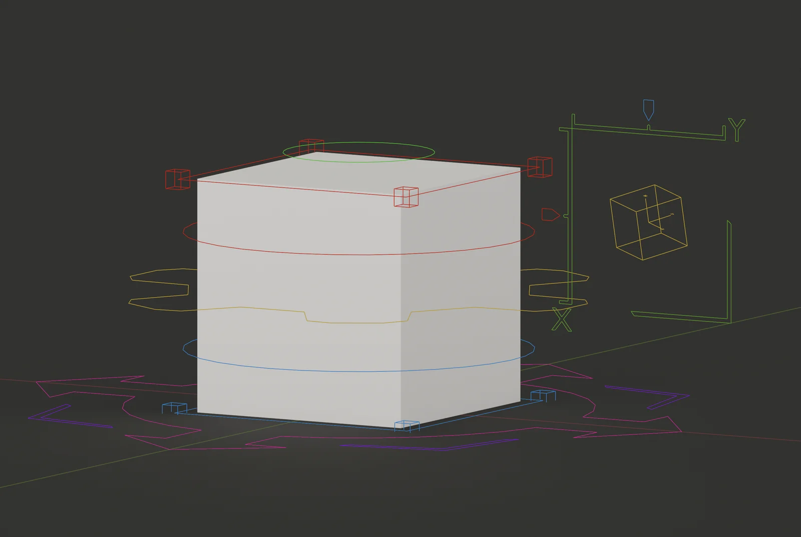 This rigged cube model includes a bone-based UI panel for non-destructively adjusting its dimensions. The provided armature supports squash, stretch, and twisting movements. It also includes a custom RigUI script designed for Blender 4.0 and above to handle layer management.