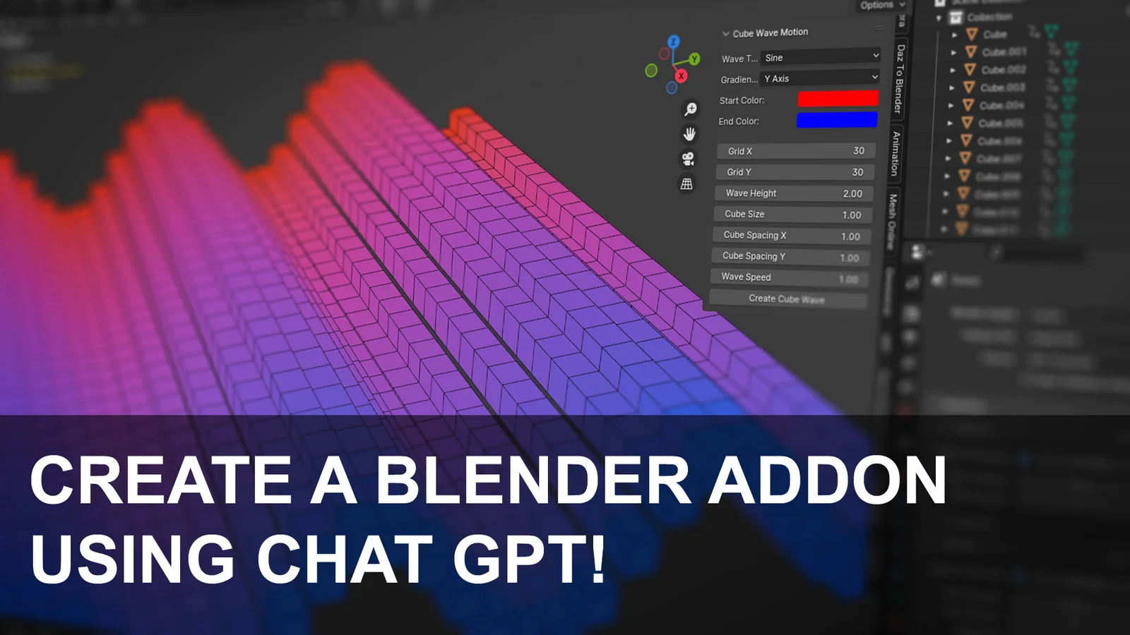 Cube Wave Animator is a demonstration add-on for Blender that animates a wave of cubes. It was developed to serve as a practical example of using OpenAI's ChatGPT to write Python scripts and build custom tools within the Blender ecosystem.