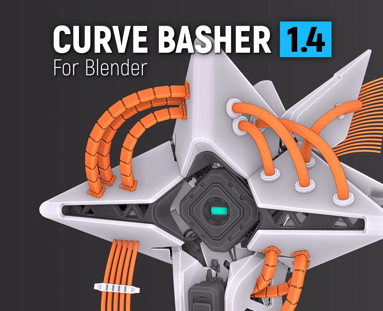 The add-on features a Curvebash Browser to quickly apply included cable or chain presets to plain curves or mesh edge selections. Users can also configure custom meshes to array along curves or attach to curve endpoints. Additional functionalities include randomization controls for scale and rotation, hooked curve points via control volumes, and the ability to draw curves directly on mesh surfaces. A sample sci-fi drone model is included with the tool.