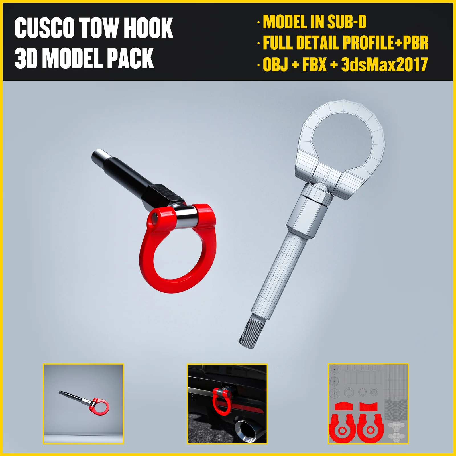 A 3D model of a CUSCO-style tow hook intended for automotive and vehicle projects. The asset features non-overlapping UV mapping and is supplied with 8K resolution PBR textures. It is provided in several standard 3D formats, including FBX, OBJ, and STL, making it compatible with various 3D applications.