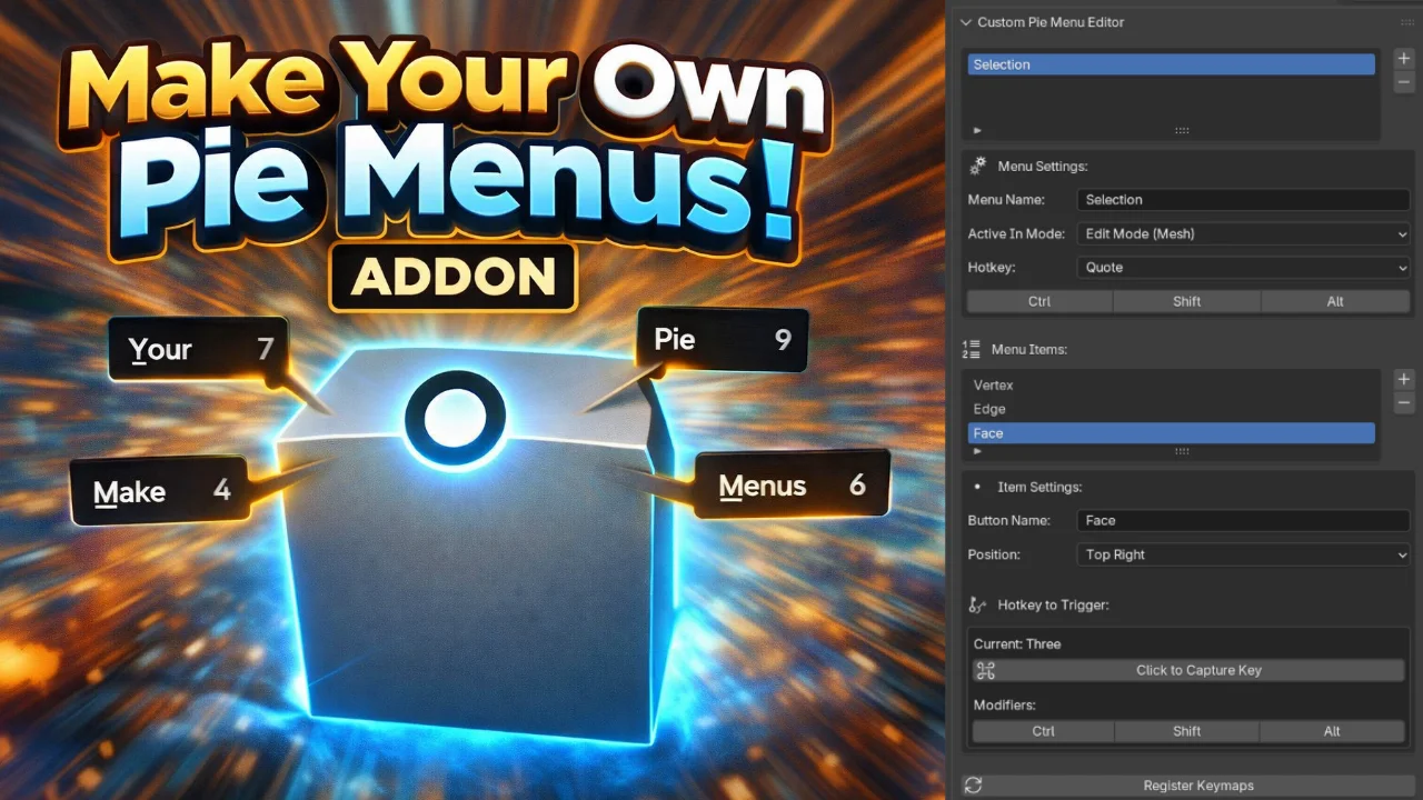 This add-on provides tools to build personalized pie menus within Blender's interface. It allows users to define context-sensitive radial menus to access specific tools and operators quickly, streamlining individual workflows.