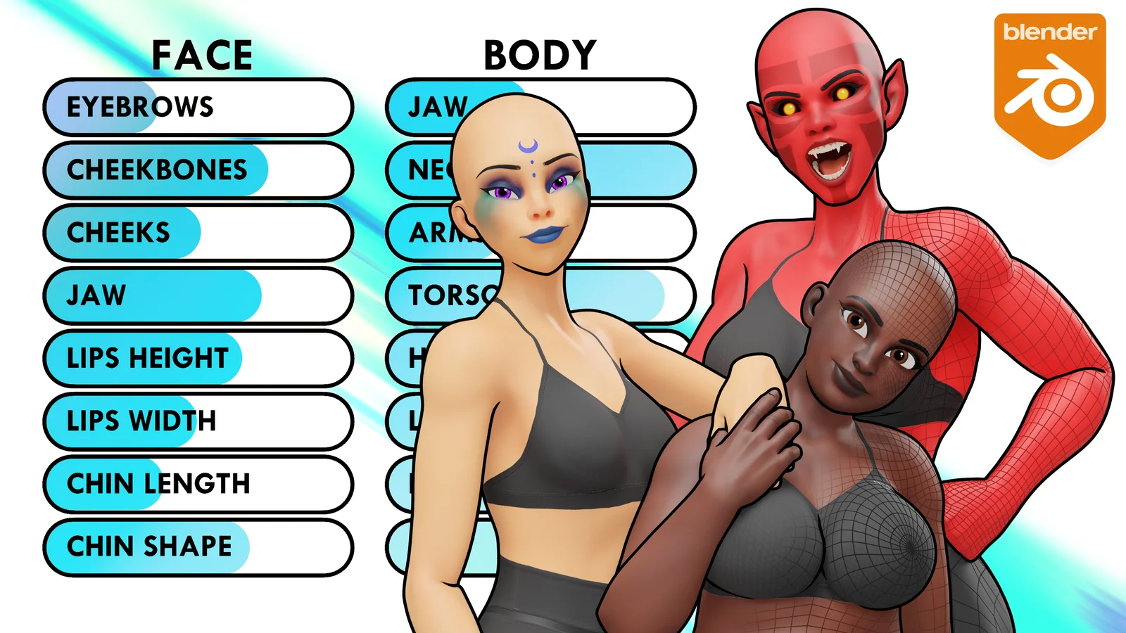 A rigged female basemesh that includes a custom interface for slider-based character creation. Users can adjust body proportions, facial features, height, and overall silhouette directly within Blender. The character is fully rigged using the Rigify system, allowing for immediate posing and animation.