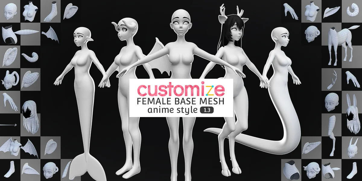 This anime-style female base mesh provides a starting point for character creation. It includes up to 106 customizable variation parts that can be mixed and matched to build different character foundations. The geometry features quad-based, clean topology that is subdivision-ready and optimized for sculpting, retopology, or game development workflows.