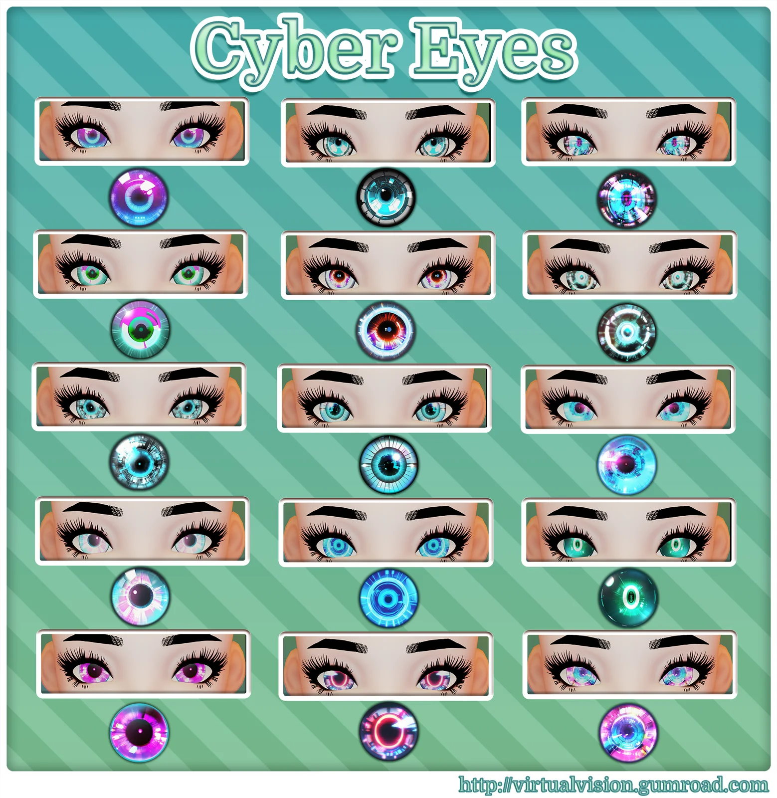 This text provides a collection of 15 cyber-themed eye textures for 3D character models, avatars, and VTubing setups. The textures are supplied in PNG format and can be applied to existing eye materials in software pipelines supporting VRM, MMD, or VRChat avatars. The assets were created using a combination of AI generation and manual editing.