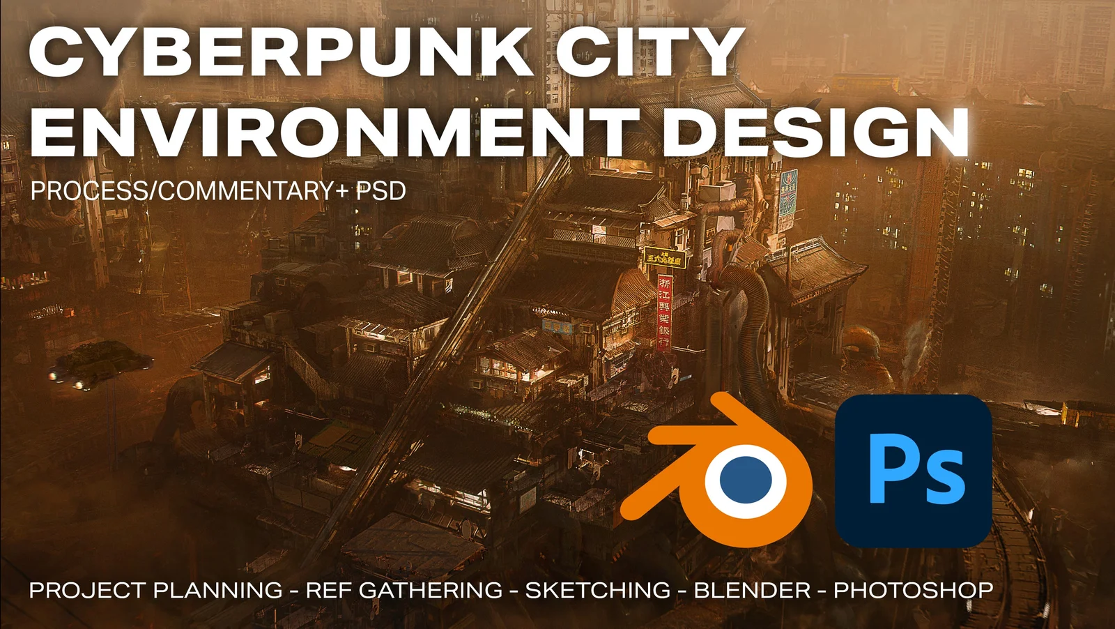 A start-to-finish tutorial covering the creation of a cyberpunk city concept art project. The course explores the entire workflow, beginning with gathering references and project planning. It demonstrates the integration of 3D modeling techniques in Blender with 2D sketching and paint-overs, providing insights into environment design and portfolio development. A PSD file of the final artwork is included.