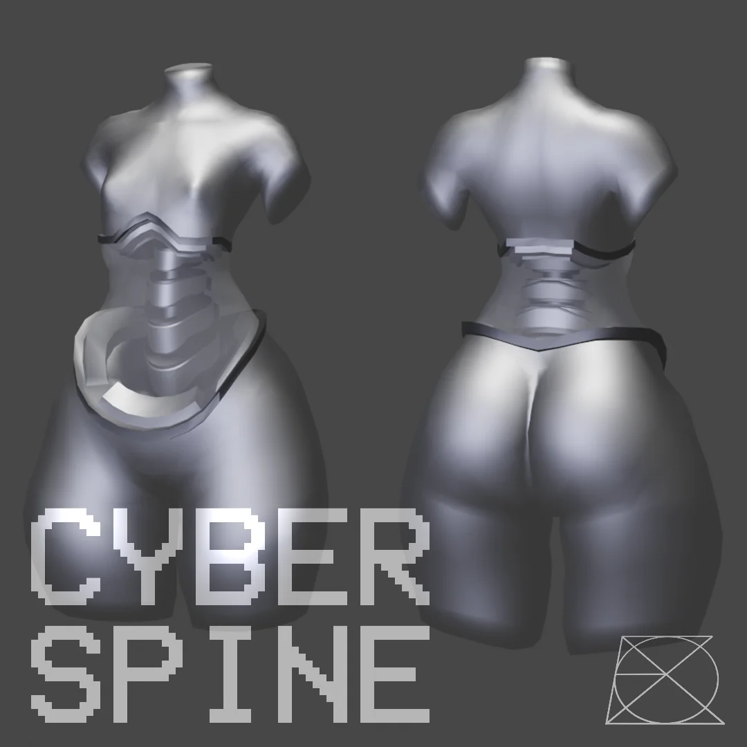 An unrigged cybernetic spine 3D model, originally fitted to the AnimeBase 2.0 base but split into two sections to allow adaptation to other character bases. The package provides the geometry in FBX format and includes two pre-configured materials for Blender. Instructions for achieving a specific transparent material look are also included.
