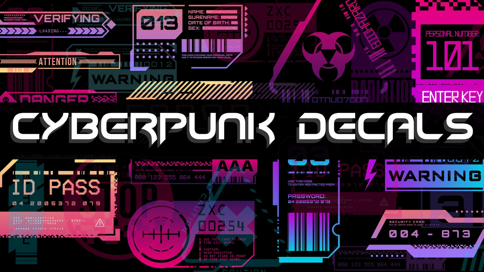 A collection of 60 high-resolution cyberpunk decals, featuring 20 unique designs with 40 color variations. The decals are provided as 4K transparent PNG files, making them compatible with standard texturing workflows. For Blender users, the pack includes a pre-configured file with prepared modifiers for easy appending. Additionally, the assets are formatted for immediate use with DECALmachine and Kit Ops. The included materials allow for straightforward color adjustments and include options for emission.