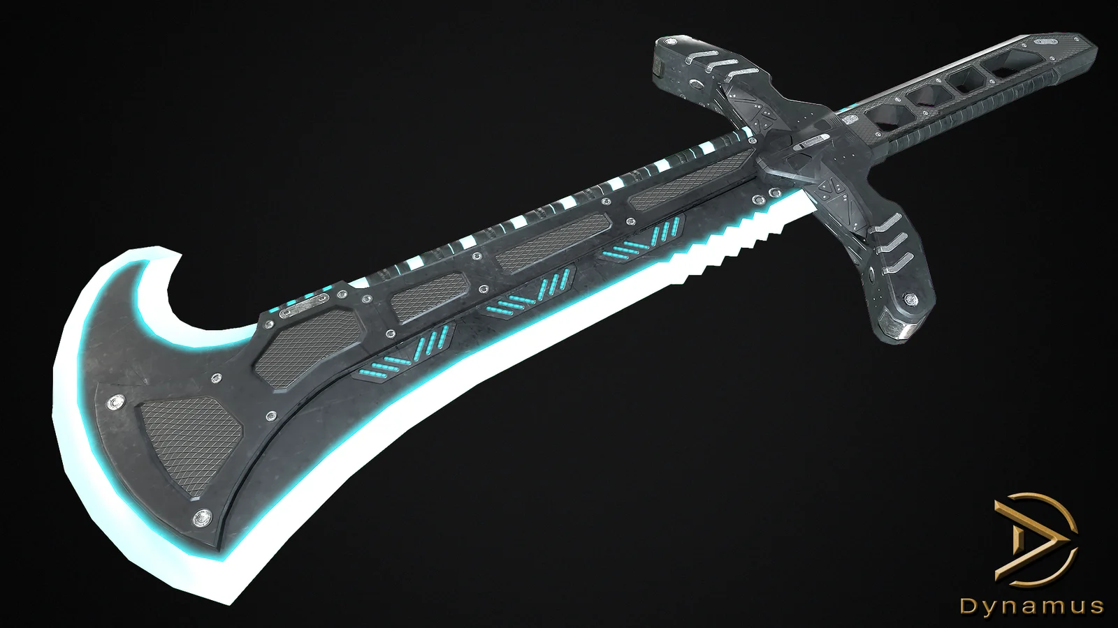 A low-poly cyberpunk-style scimitar model optimized for real-time engines and rendering. The model consists of 1,308 triangles and is designed to use a single material. It comes with 10 different color variations and includes texture maps provided in 1K, 2K, and 4K resolutions. The provided texture sets contain albedo, normal, roughness, metallic, ambient occlusion, and emissive maps.