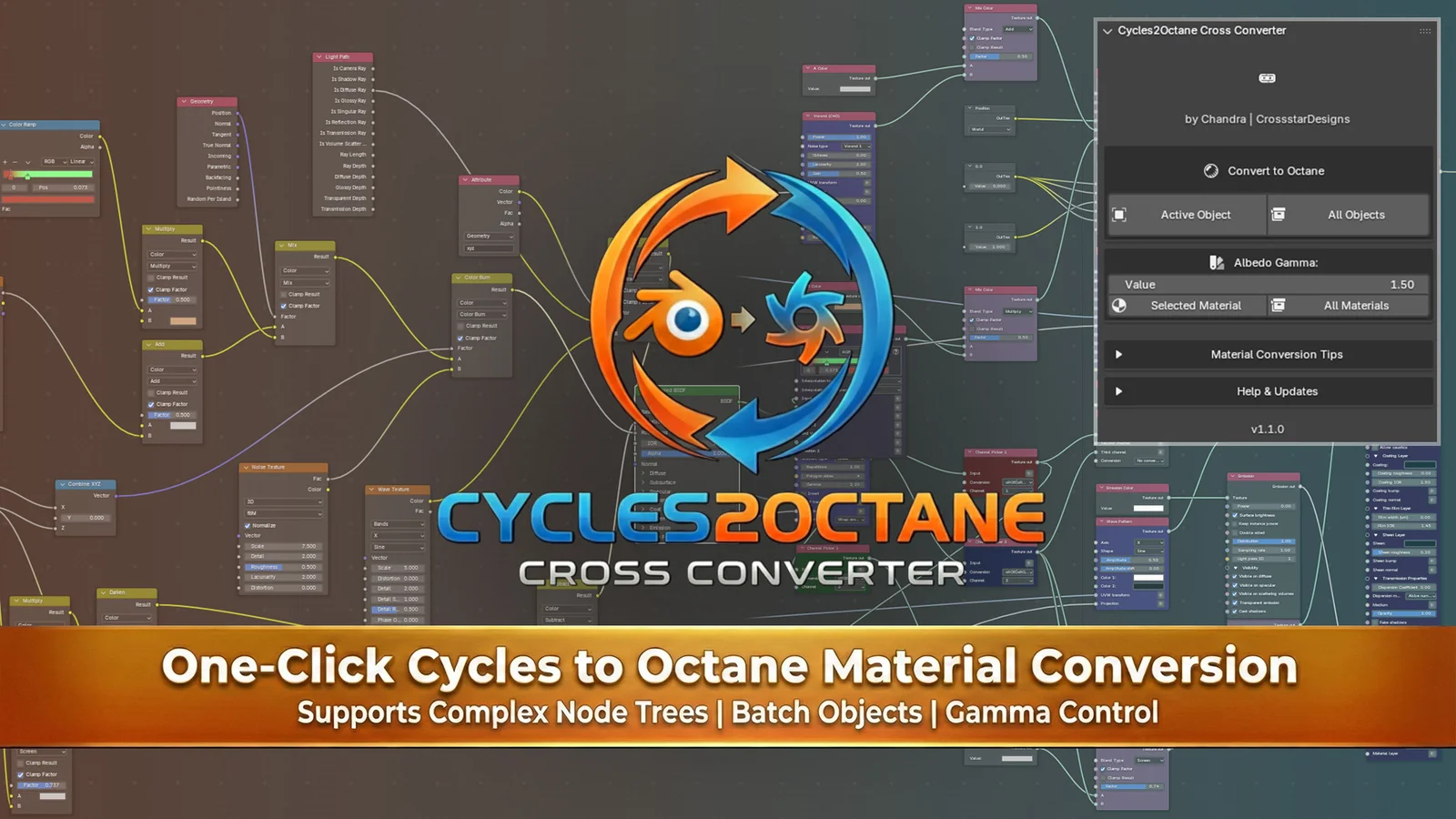 Cross Converter is an add-on that translates Cycles material setups into Octane render materials. It analyzes the existing node structure and automatically configures Octane equivalents, including context-specific adjustments for glass, subsurface scattering, and emission. The tool traces backward through node chains to preserve connections and correctly scales procedural textures based on object dimensions. It supports over 40 node types, including various shaders, textures, and math operations, and provides batch conversion capabilities for processing multiple objects simultaneously.