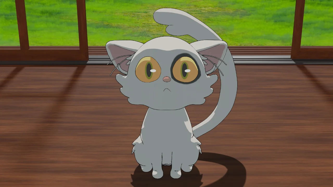 A 3D character model of the white cat Daijin from the animated film Suzume no Tojimari. This Blender file includes the character mesh, armature rig, textures, a background environment, and lighting setup.