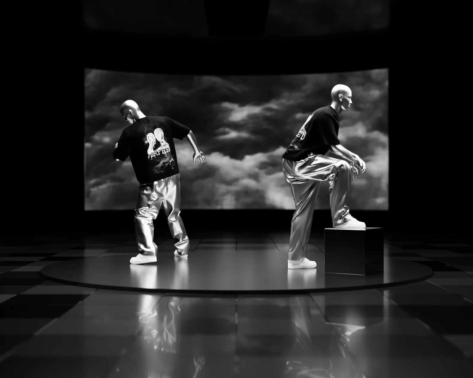 This pre-made Blender scene provides a 3D rotating mockup featuring two dark t-shirts. It is configured for users to insert their own custom designs by swapping out the material's image textures. The included setup is animation-ready, allowing apparel designers to quickly render spinning showcase videos for social media promotion.
