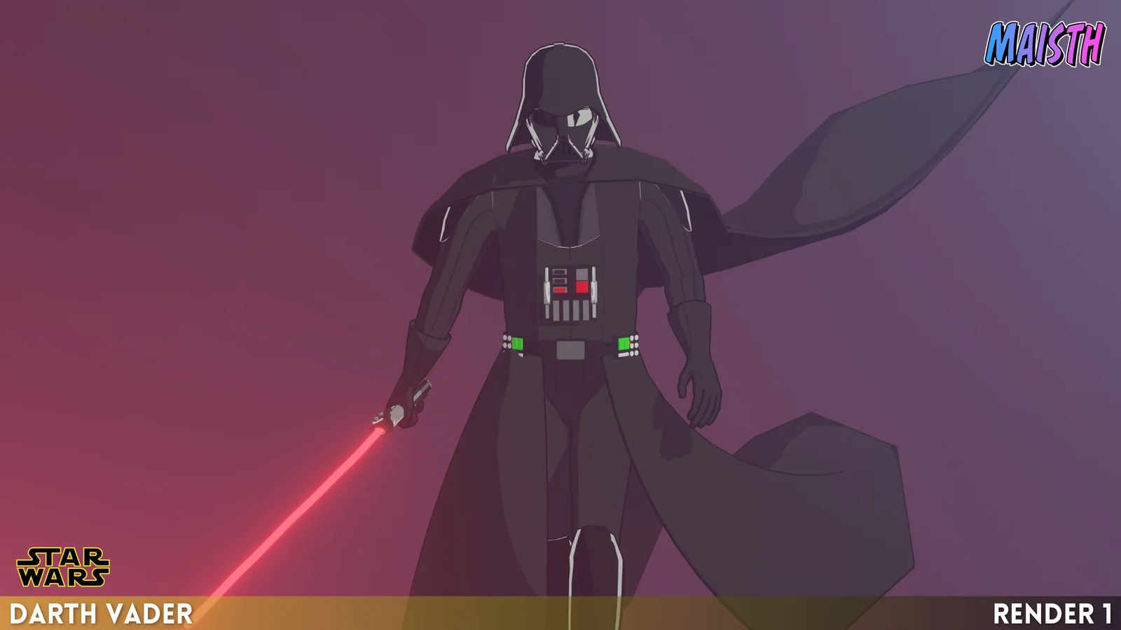 A 3D character model of Darth Vader, featuring a stylized, cell-shaded aesthetic loosely inspired by the Star Wars Rebels animated series.