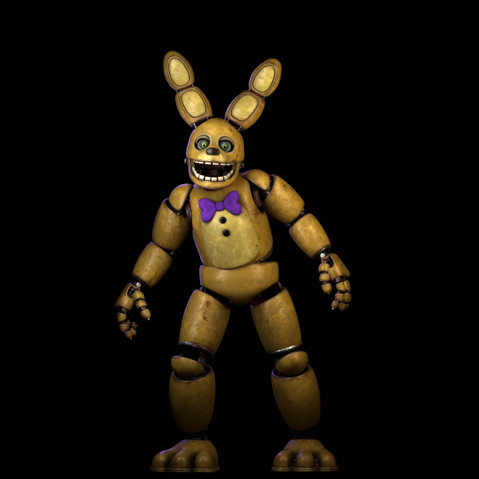 This is a 3D character model of Spring Bonnie from the Five Nights at Freddy's franchise, specifically based on the Freddy Fazbear's Pizzeria Simulator (FFPS) design. It is a remodeled version of the Dead by Daylight Springtrap collaboration model. The character features base suit and eye textures created in Substance Painter.