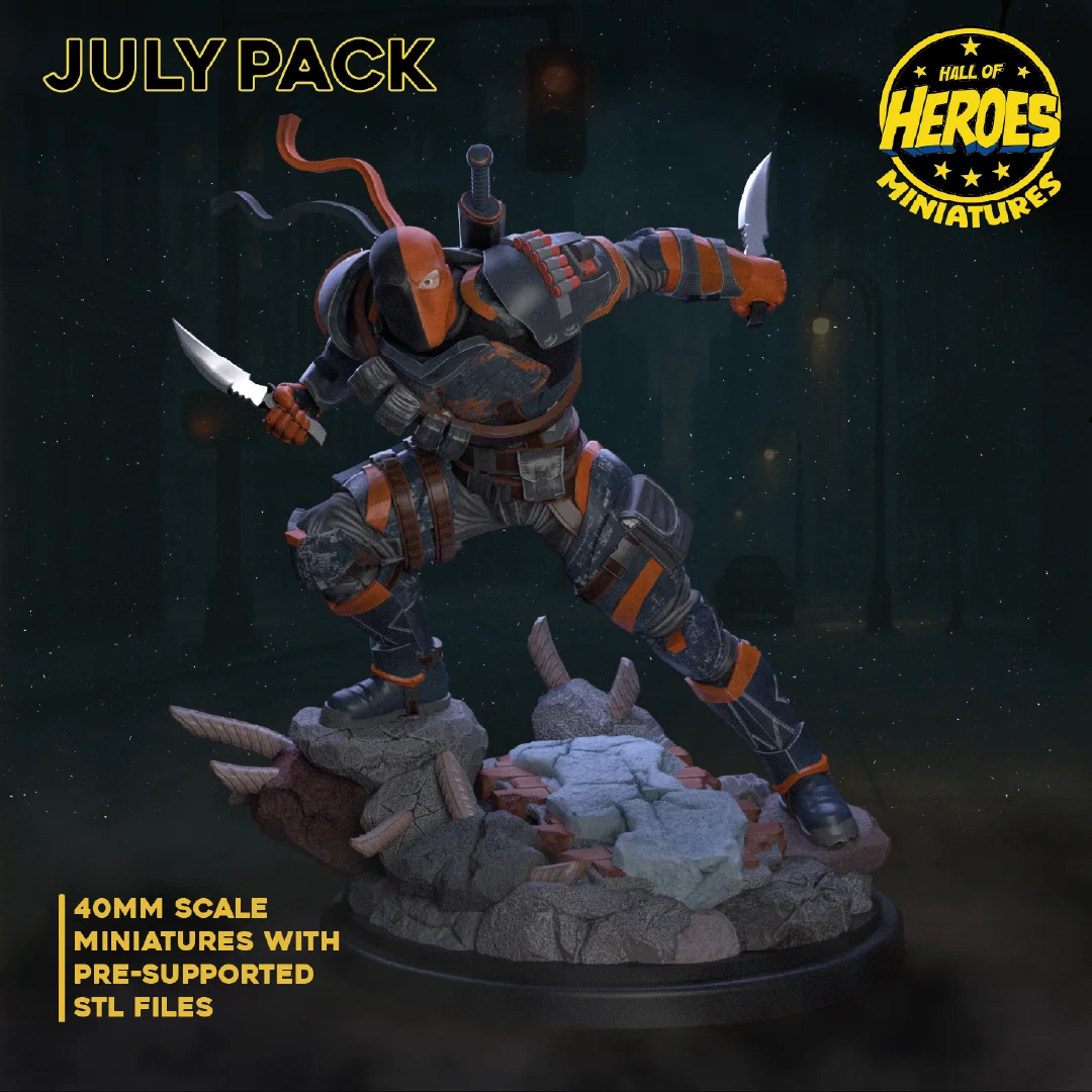 This product provides a 40mm scale 3D printable miniature model of Deathstroke from the Arkham series. The set includes the main character figure and a 35mm base. It comes with high-resolution STL files and includes pre-supported versions intended for resin 3D printing. The model is designed for use in tabletop gaming or as a display piece.