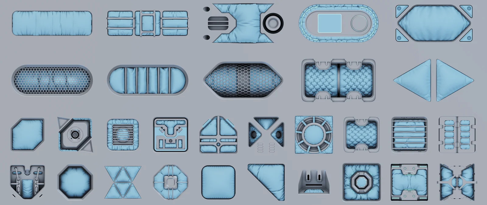 This collection provides 70 sci-fi clothing pad decals designed to add detail to models without increasing geometry. The decals are baked as DecalMachine 2.6.4 subset decals, meaning sub-materials are pre-assigned to the cloth sections. Each decal is baked at maximum resolution with 4x anti-aliasing and 512x ambient occlusion to ensure clean results without shading artifacts.