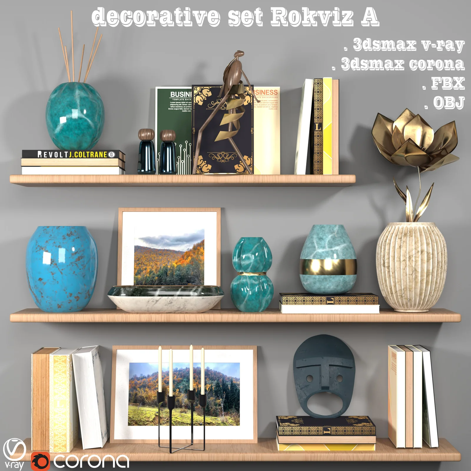 A collection of textured 3D models intended for interior decoration and close-up renders. The assets are provided in standard OBJ and FBX file formats for import into Blender, alongside the associated texture files.