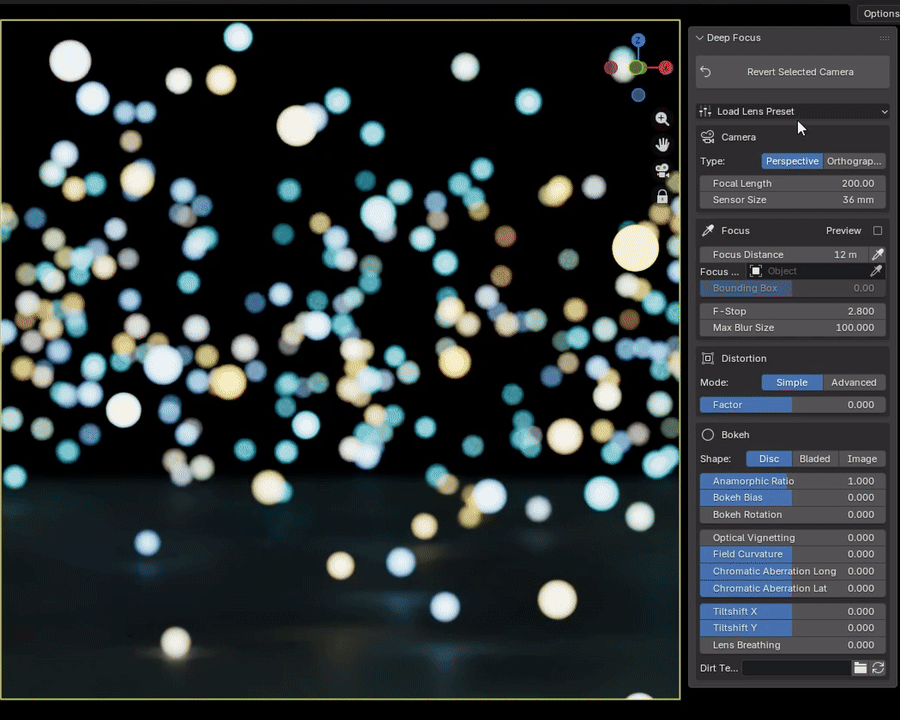 DeepFocus is a physical camera lens simulator for Blender that provides customizable bokeh and cinematic depth of field. It uses an Open Shading Language (OSL) camera to simulate various lens characteristics. The addon includes built-in F-stop controls and interactive focus peaking for configuring depth of field.