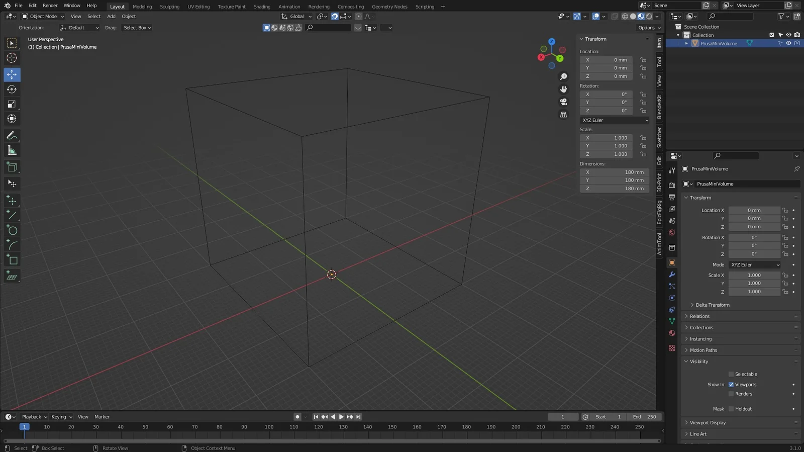 This is a starter Blender scene optimized for 3D printing workflows. It is configured with proper real-world units to ensure that exported models maintain accurate physical dimensions when brought into slicing software. The file includes a visual representation of a printer's build volume, which is configured by default to match the dimensions of a Prusa Mini. Users can customize the print area to match their specific hardware by modifying the dimensions of the included volume object.