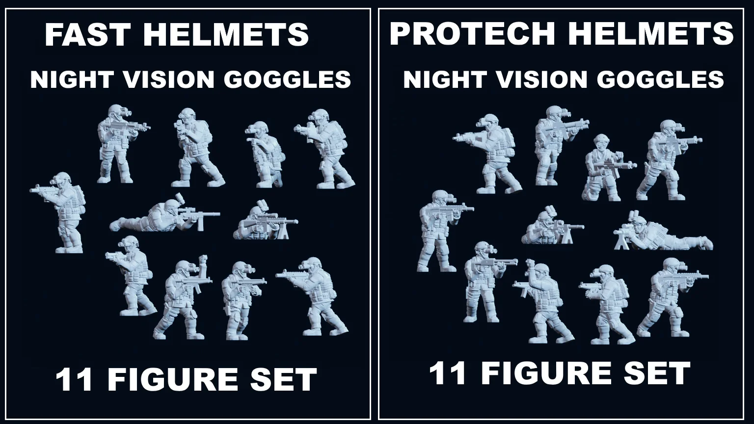 This collection features 3D printable models of Delta Force operators equipped with night vision goggles. The set includes 22 distinct figures scaled to 1/100, aligning with traditional 15mm wargaming proportions where a standard human stands 18mm tall. The files come pre-supported and ready for 3D printing. While the figures can be scaled up easily, scaling below 50% is not recommended due to fine details becoming too thin to print reliably.